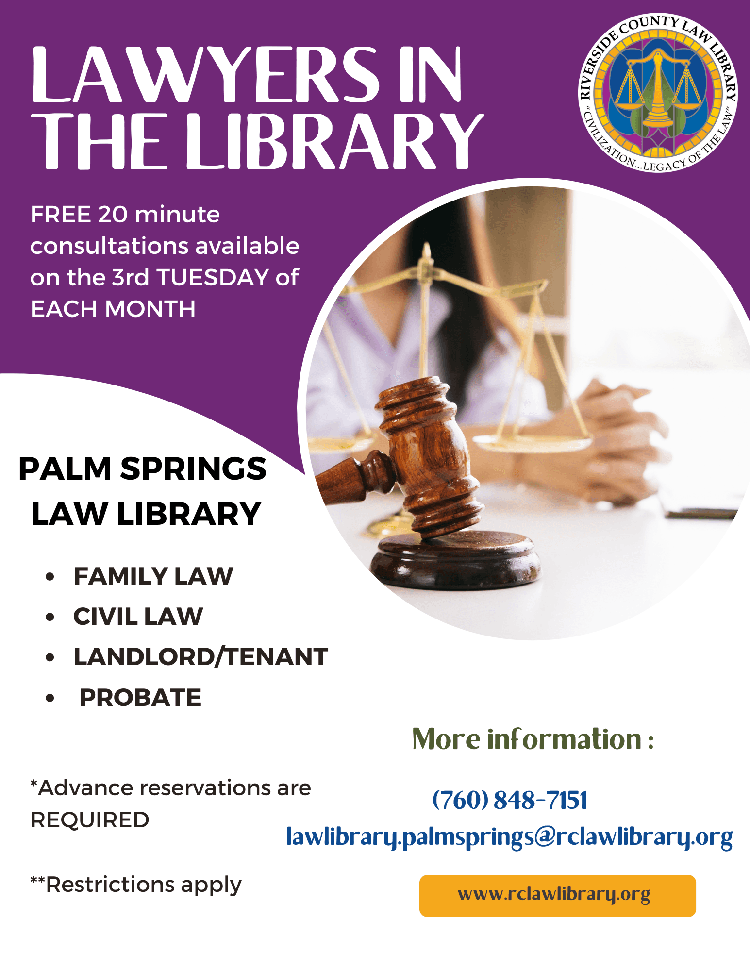 Free 20 min consultation on the 3rd Tuesday of every month. Family Law, Civil Law, Landlord/Tenant, Probate